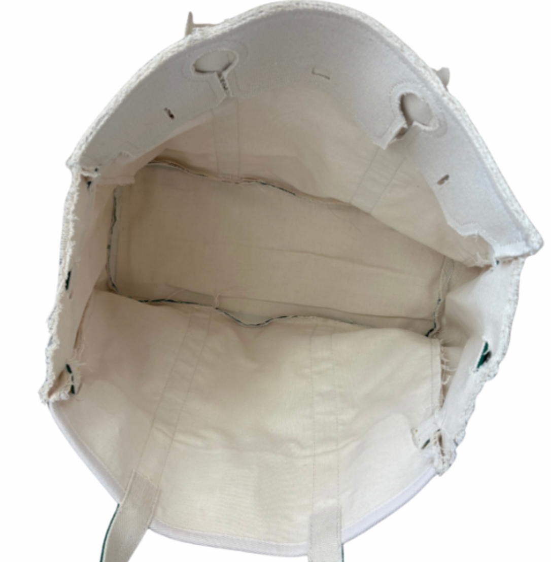 Eco-Friendly Craftsmanship: Hand-cut and sewn from exceptionally rare, vintage Lineman canvas totes, embodies sustainability. Navy will vary in hue due to recycled materials as well as the canvas. Main interior large compartment, no side pockets.